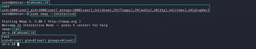 Here we used nmap for demonstration purposes. We searched for nmap in GTFOBins and selected sudo for exploit. Here are two methods to exploit using nmap. You can use based on your exploit environment. Here I exploited both methods.