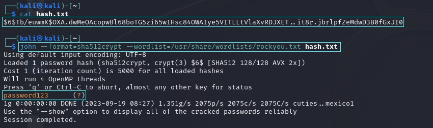 john --format=sha512crypt --wordlist=/usr/share/wordlists/rockyou.txt hash.txt