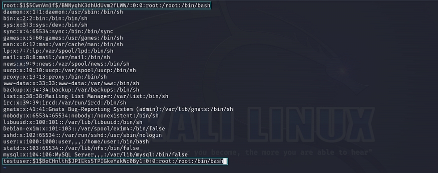 Now, our task is to replace the ‘x’ value of the root user in the /etc/passwd file with the custom generated password hash using the openssl. We can also achieve this by creating a new user entry in a new line within the /etc/passwd file, similar to the ‘testuser’ example shown in the image.