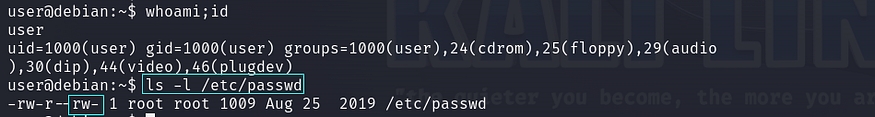 Critically, a security risk arises from the misconfiguration of writable permissions granted to all users for the /etc/passwd file. Our objective is to leverage these writable permissions on the /etc/passwd file to acquire root privileges. To ascertain the current writeable permission status, we can execute the command ‘ls -la /etc/passwd’.